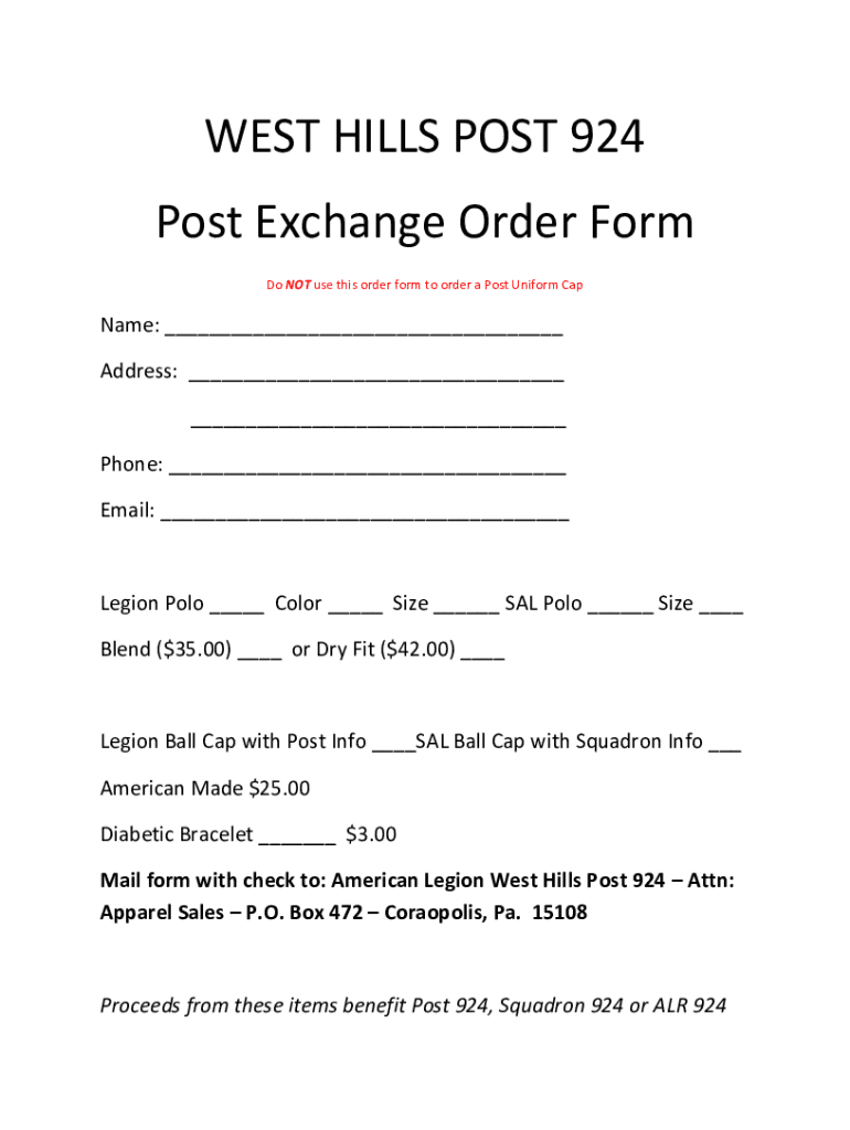 WEST HILLS POST 924 Post Exchange Order Form Do NOT use this order form to order a Post Uniform Carnage: Address: Phone: Email: Legion Polo Color Size SAL Polo Size Blend ($35.00) or Dry Fit ($42.00)