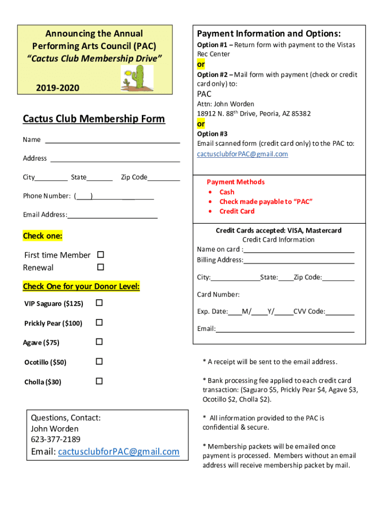 Announcing the Annual Performing Arts Council (PAC) Cactus Club Membership DriveOption #1 Return form with payment to the Vistas Rec CenterorOption #2 Mail form with payment (check or credit card