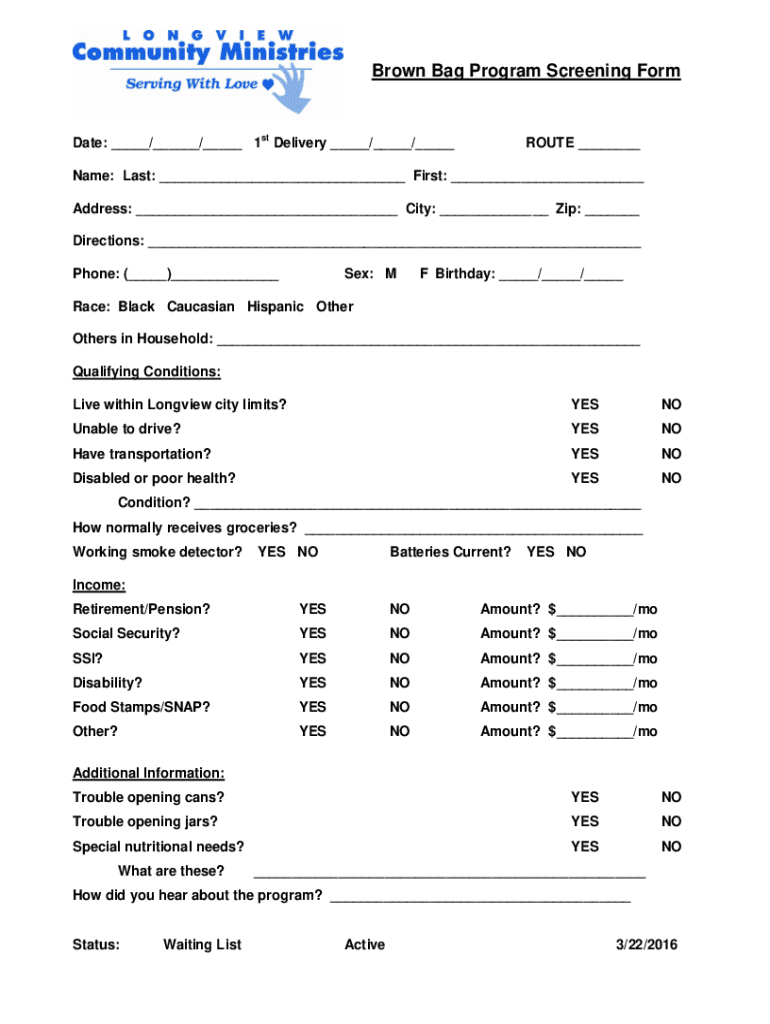 Brown Bag Program Screening Format: / / 1st Delivery / / ROUTE Name: Last: First: Address: City: Zip: Directions: Phone: () Sex: MF Birthday: / / Race: Black Caucasian Hispanic Other Others in Household: