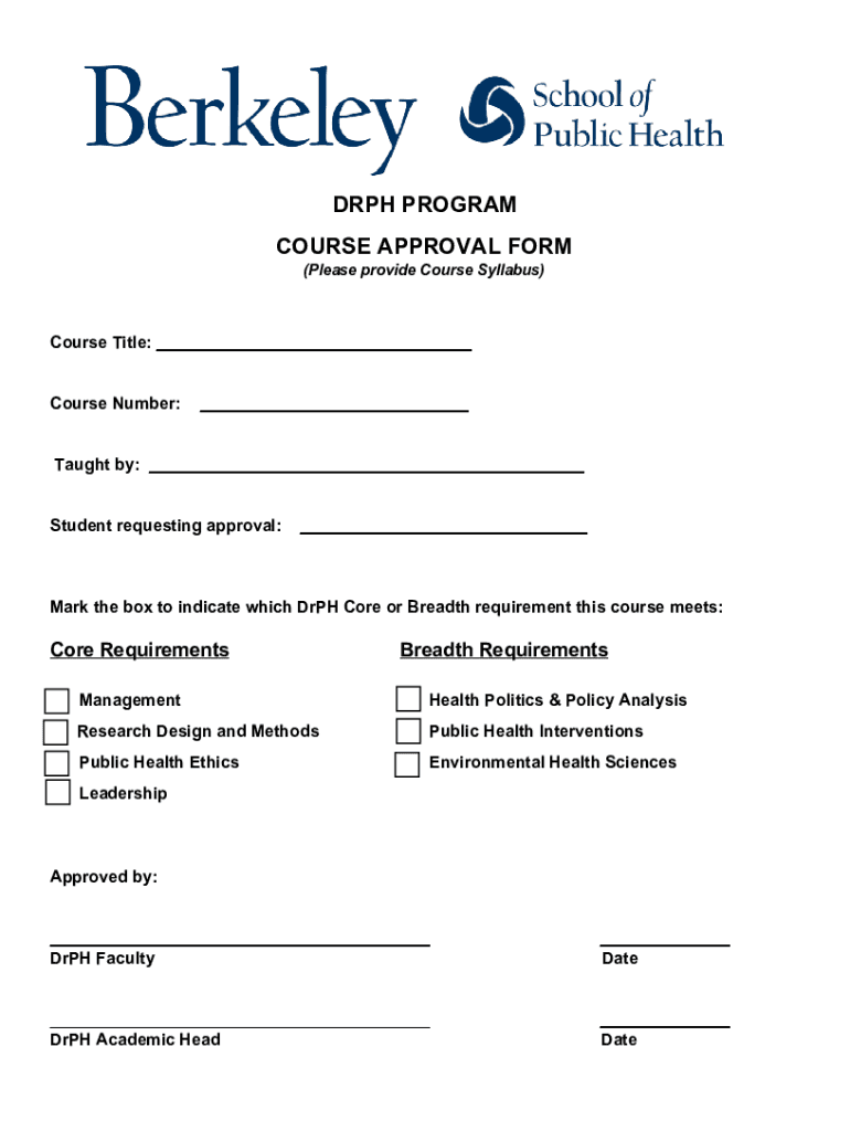 DPH PROGRAM COURSE APPROVAL FORM (Please provide Course Syllabus)Course Title: Course Number: Taught by: Student requesting approval: Mark the box to indicate which DPH Core or Breadth requirement