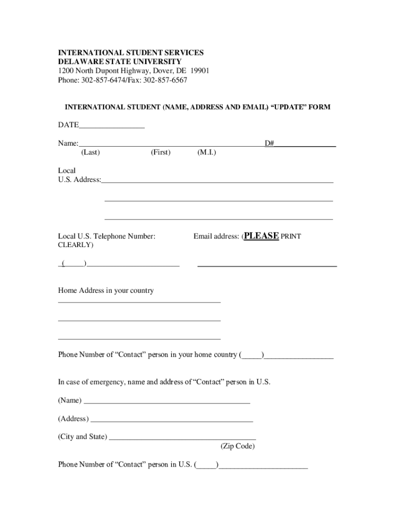 INTERNATIONAL STUDENT SERVICES DELAWARE STATE UNIVERSITY 1200 North Dupont Highway, Dover, DE 19901 Phone: 3028576474/Fax: 3028576567 INTERNATIONAL STUDENT (NAME, ADDRESS AND EMAIL) UPDATE FORMAT