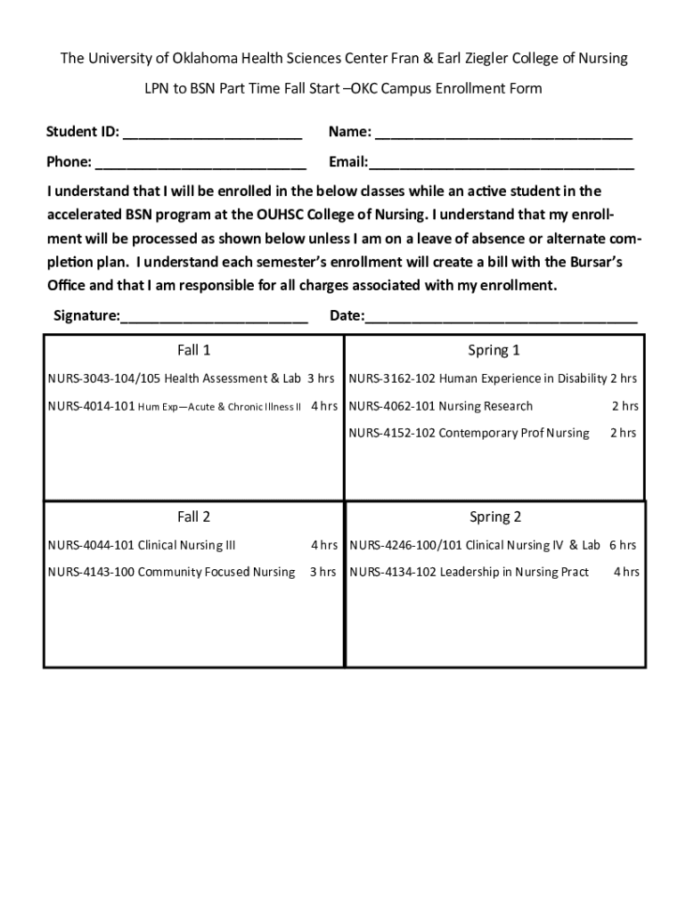 The University of Oklahoma Health Sciences Center Fran & Earl Ziegler College of Nursing LPN to BSN Part Time Fall Start OK Campus Enrollment Form Student ID: Name: Phone: Email: I understand that