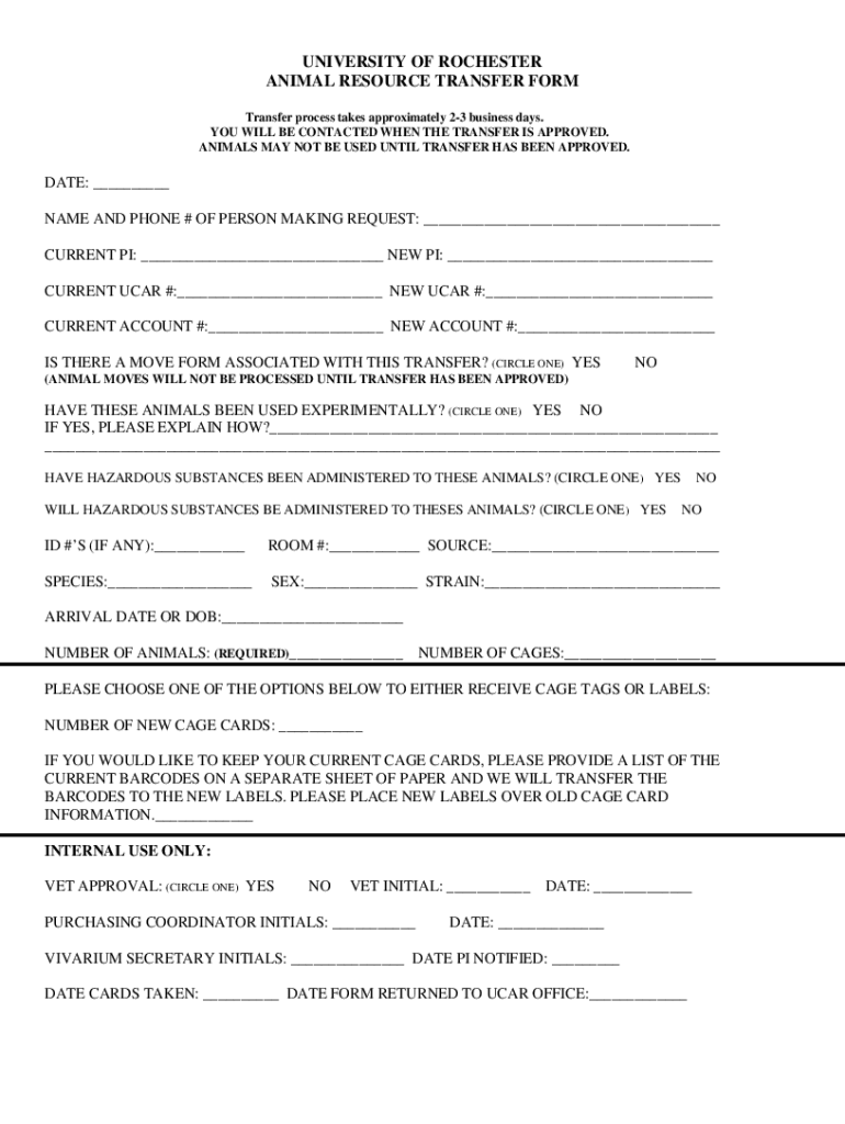 UNIVERSITY OF ROCHESTER ANIMAL RESOURCE TRANSFER FORM Transfer process takes approximately 23 business days. YOU WILL BE CONTACTED WHEN THE TRANSFER IS APPROVED. ANIMALS MAY NOT BE USED UNTIL TRANSFER