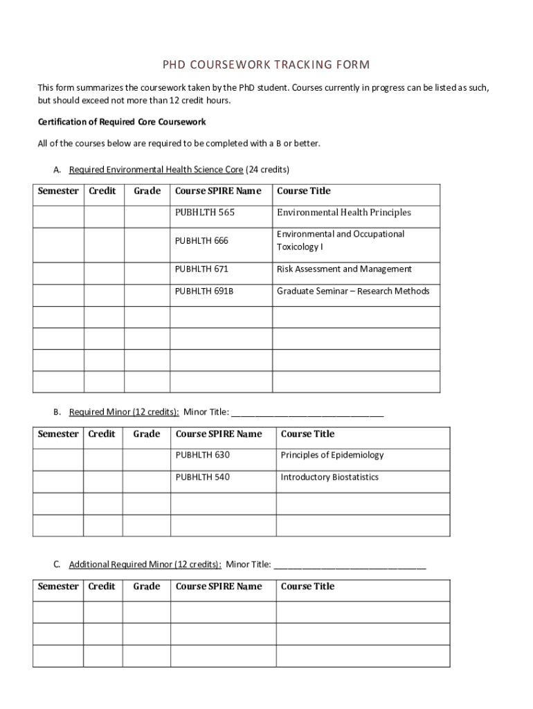 This form summarizes the coursework taken by the PhD student. Courses currently in progress can be listed as such,