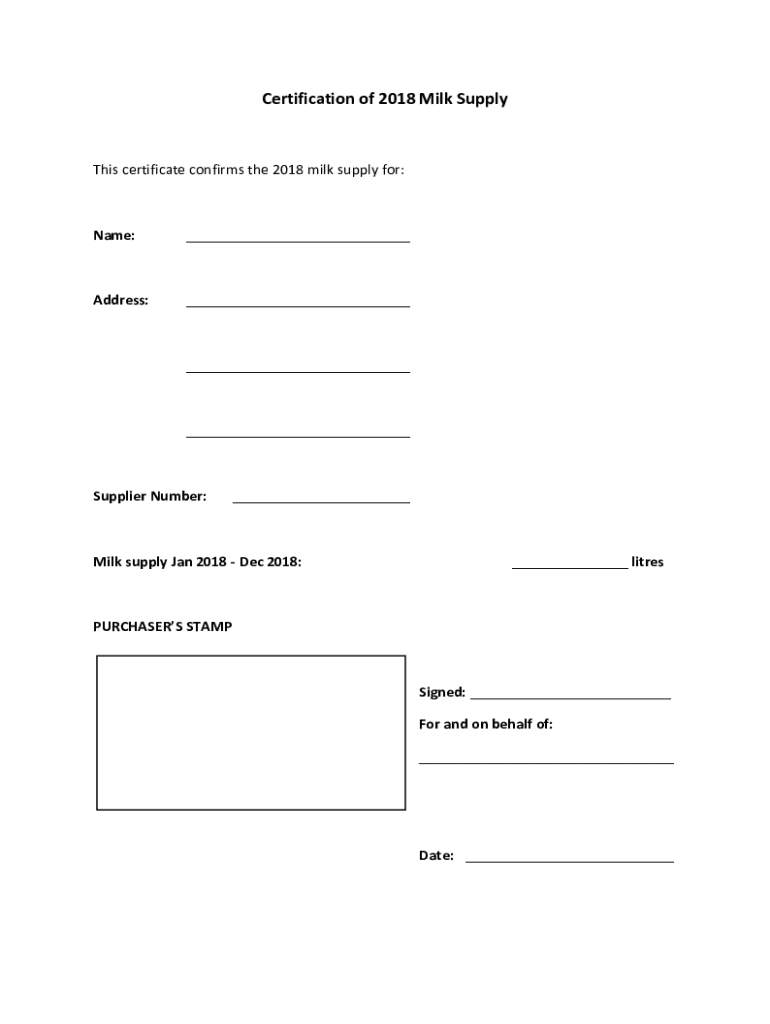 Certification of 2018 Milk SupplyThis certificate confirms the 2018 milk supply for:Name: Address: Supplier Number: Milk supply Jan 2018 Dec 2018: litresPURCHASERS Campaigned: For and on behalf of:
