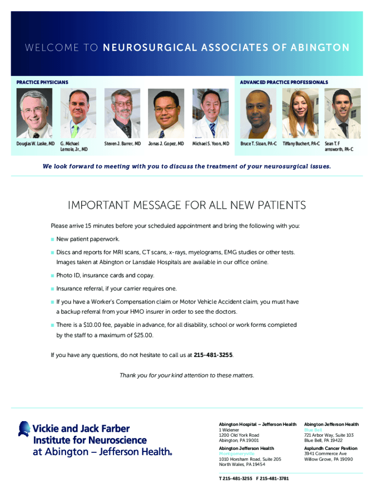 W E LCD M E TO NEUROSURGICAL ASSOCIATES OF ABINGTONPRACTICE PHYSICIANS Douglas W. Lake, MDG. Michael