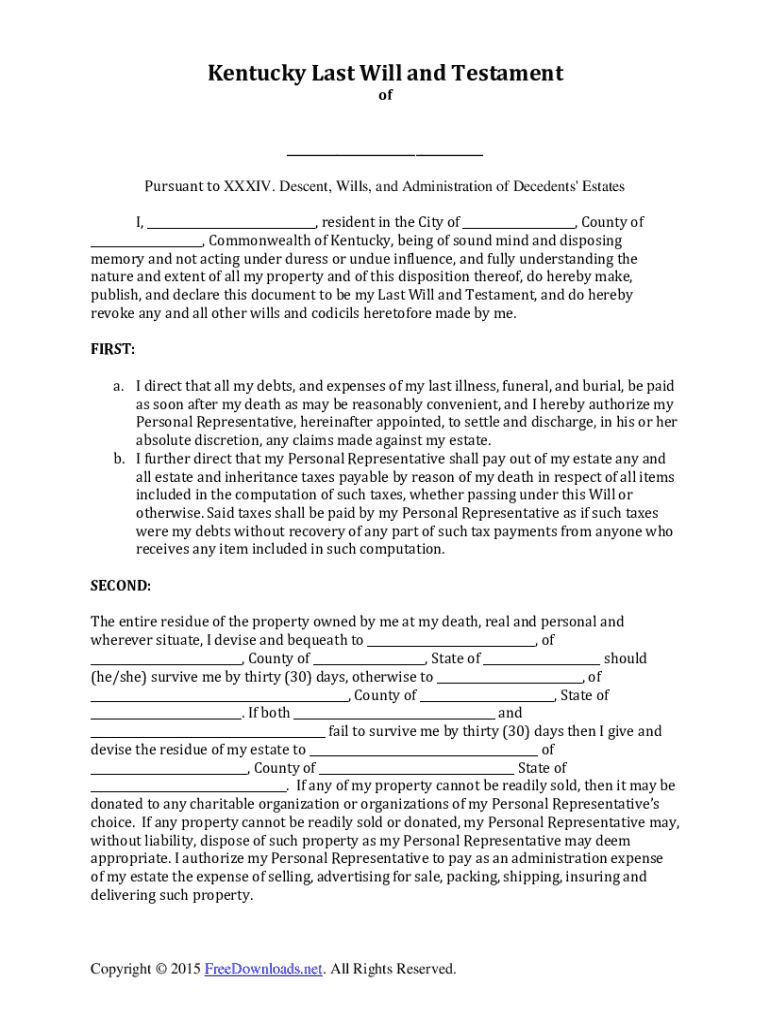 Kentucky Last Will and Testament of Pursuant to XXXIV. Descent, Wills, and Administration of Decedents Estates I, resident in the City of, County of, Commonwealth of Kentucky, being of sound mind