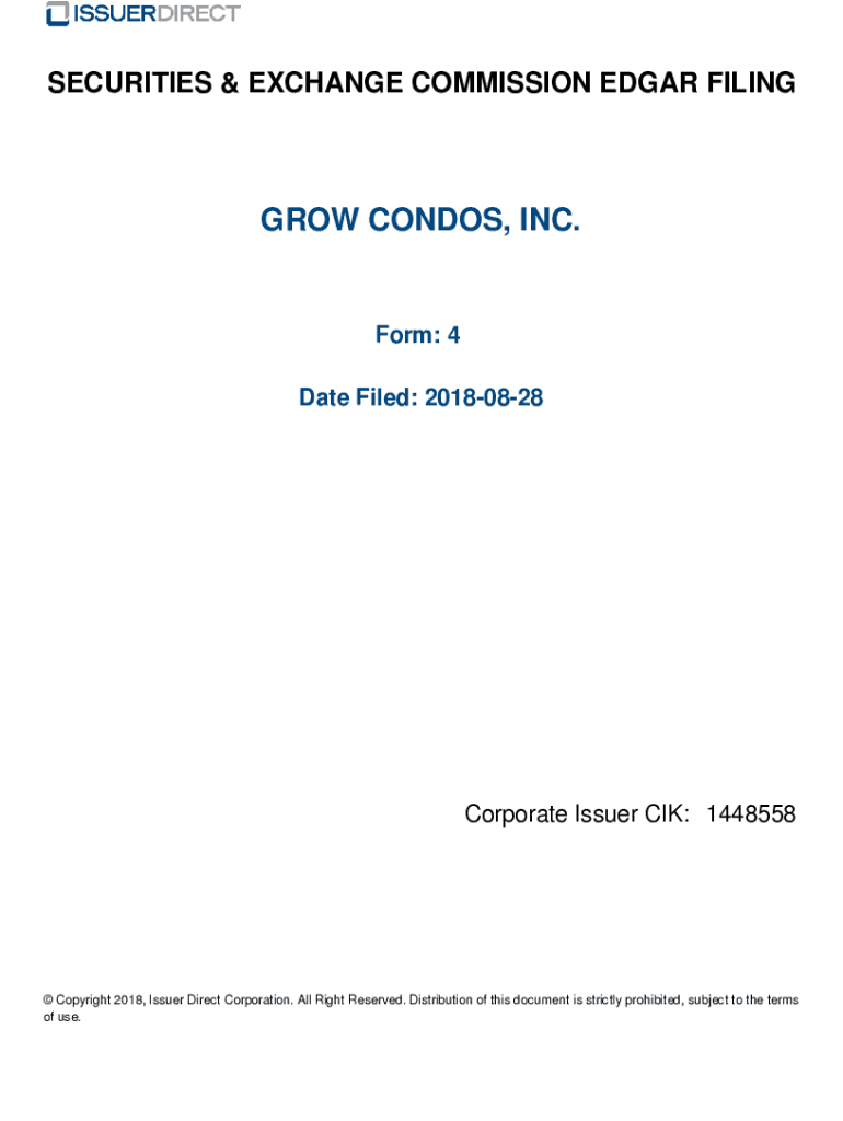 SECURITIES & EXCHANGE COMMISSION EDGAR FILINGGROW CONDOS, INC. Form: 4 Date Filed: 20180828Corporate Issuer CIK: 1448558 Copyright 2018, Issuer Direct Corporation. All Right Reserved. Distribution