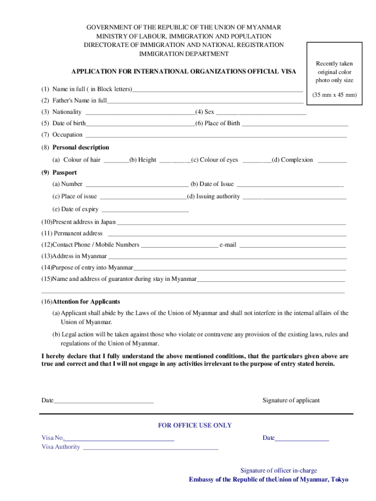 GOVERNMENT OF THE REPUBLIC OF THE UNION OF MYANMAR MINISTRY OF Labor, IMMIGRATION AND POPULATION DIRECTORATE OF IMMIGRATION AND NATIONAL REGISTRATION IMMIGRATION DEPARTMENT APPLICATION FOR INTERNATIONAL
