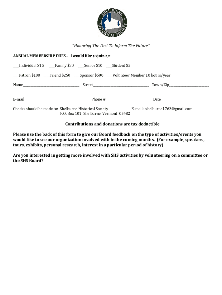 Honoring The Past To Inform The Future ANNUAL MEMBERSHIP DUES I would like to join as: Individual $15 Family $30 Senior $10 Student $5 Patron $100 Friend $250 Sponsor $500 Volunteer Member 10 hours/year