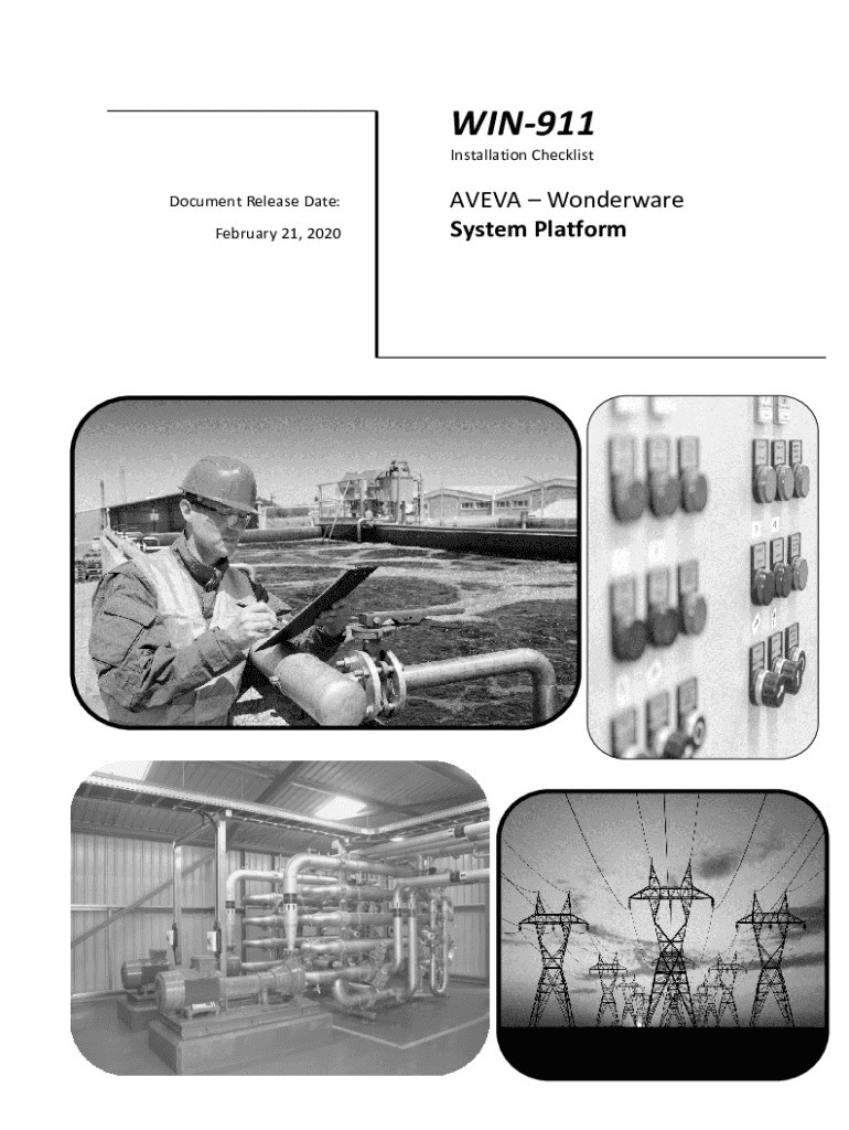 WIN911 Installation Checklist Document Release Date: February 21, 2020AVEVA Wonder ware System PlatformTable of Contents 1 2 3 456 78INSTALLATION CHECKLIST ........................................................................