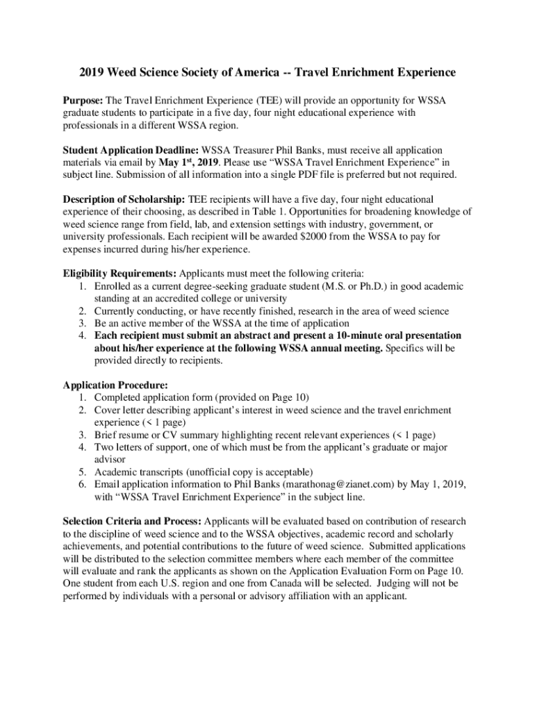 2019 Weed Science Society of America Travel Enrichment Experience Purpose: The Travel Enrichment Experience (TEE) will provide an opportunity for SSA graduate students to participate in a five day,