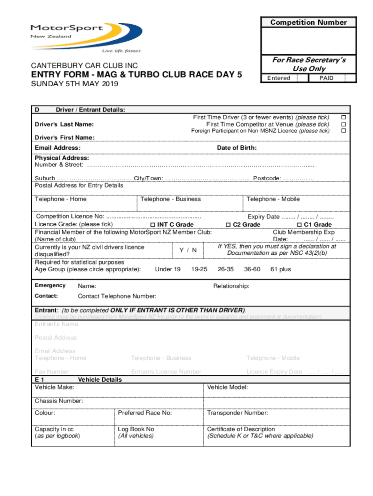 Competition Number Race Secretary's Use OnlyCANTERBURY CAR CLUB INFANTRY FORM MAG & TURBO CLUB RACE DAY 5EnteredSUNDAY 5TH MAY 2019DPAIDDriver / Entrant Details: First Time Driver (3 or fewer events)