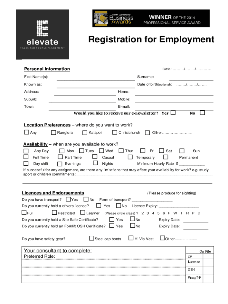 Registration for EmploymentDate: /./Personal Information First Name(s):Surname:Known as:Date of birth(optional):Address:Home:Suburb:Mobile:Town:Email:././. Would you like to receive our newsletter?
