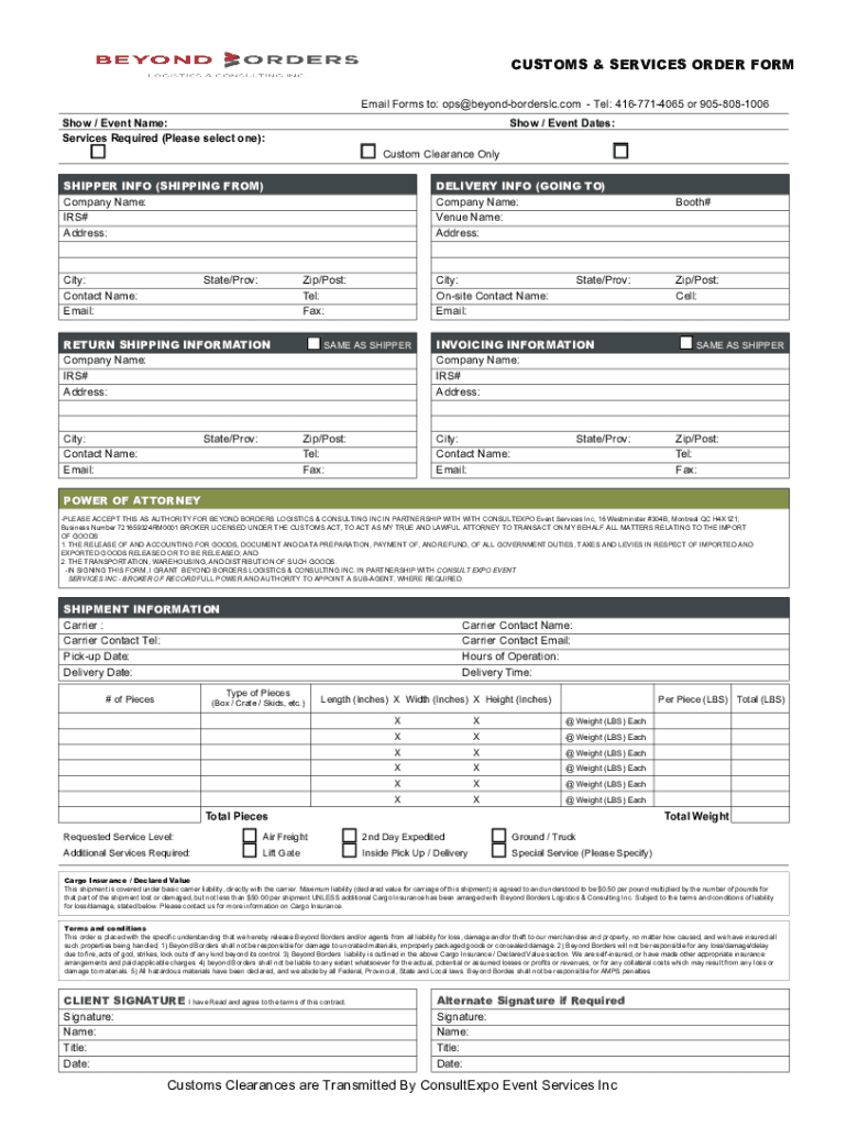 CUSTOMS & SERVICES ORDER FORM Email Forms to: ops beyondborderslc.com Tel: 4167714065 or 9058081006 Show / Event Name: Services Required (Please select one):Show / Event Dates: Custom Clearance OnlySHIPPER