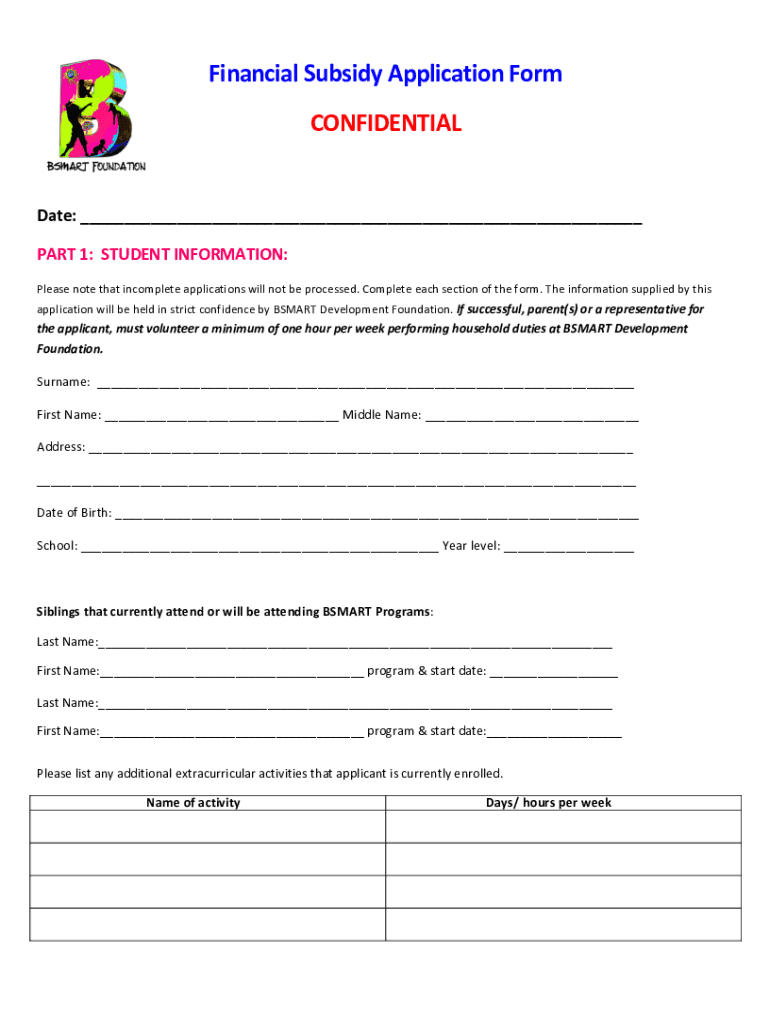 Financial 'Subsidy 'Application 'Form CONFIDENTIAL Date: PART '1: 'STUDENT 'INFORMATION: Please¬e&that&incomplete&applications&will¬&be&processed.&Complete&each§ion&of&the&form.&The&information&supplied&by&this&