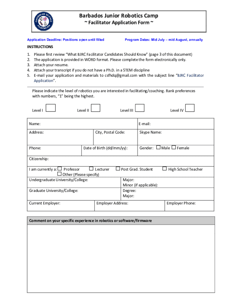 BarbadosJuniorRoboticsCamp FacilitatorApplicationForm Application Deadline: Positions open until filledProgram Dates: Mid-July mid-August, annuallyINSTRUCTIONS 1. 2. 3. 4. 5. PleasefirstreviewWhatBJRCFacilitatorCandidatesShouldKnow(page3ofthisdocument)