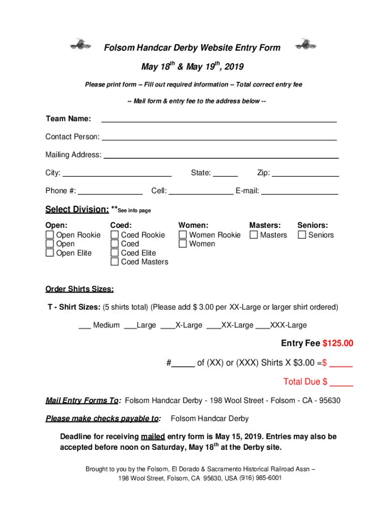 Folsom Handcar Derby Website Entry Form May 18th & May 19th, 2019 Please print form Fill out required information Total correct entry fee Mail form & entry fee to the address below Team Name: Contact