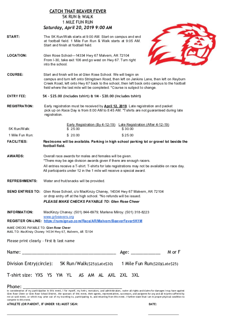 CATCH THAT BEAVER FEVER 5K RUN & WALK 1 MILE FUN RUN Saturday, April 20, 2019 9:00 AMST ART:The 5K Run/Walk starts at 9:00 AM. Start on campus and end at football field. 1 Mile Fun Run & Walk starts