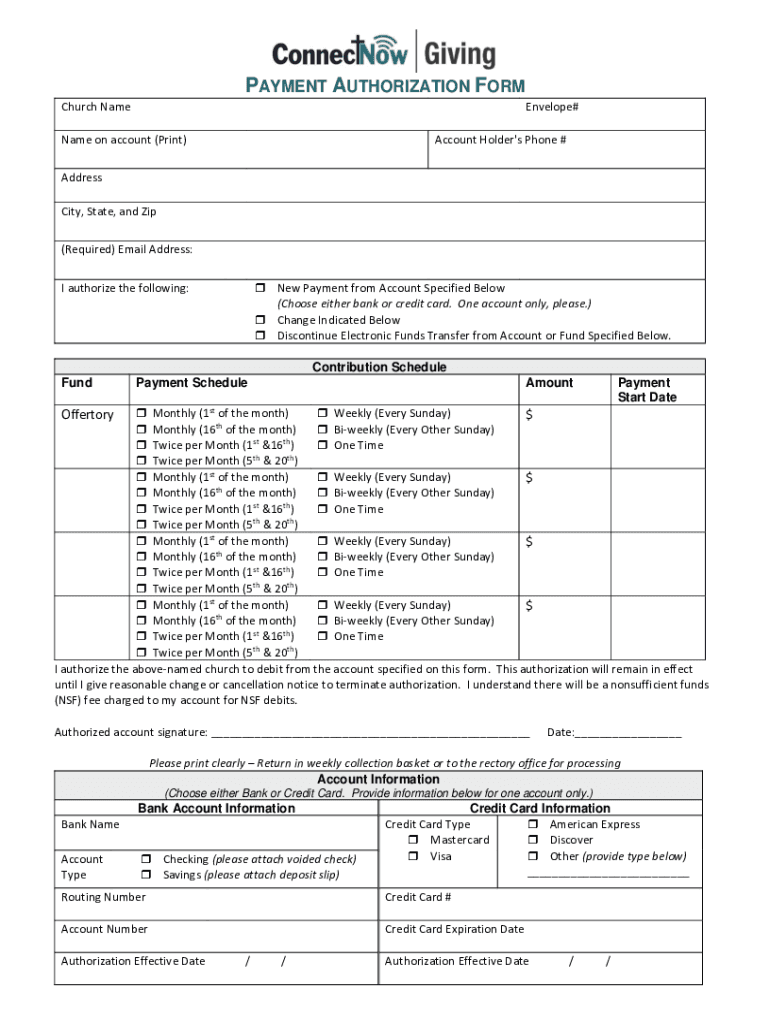 PAYMENT AUTHORIZATION FORM Church NameEnvelope#Name on account (Print)Account Holder's Phone #Address City, State, and Zip (Required) Email Address: New Payment from Account Specified Below (Choose