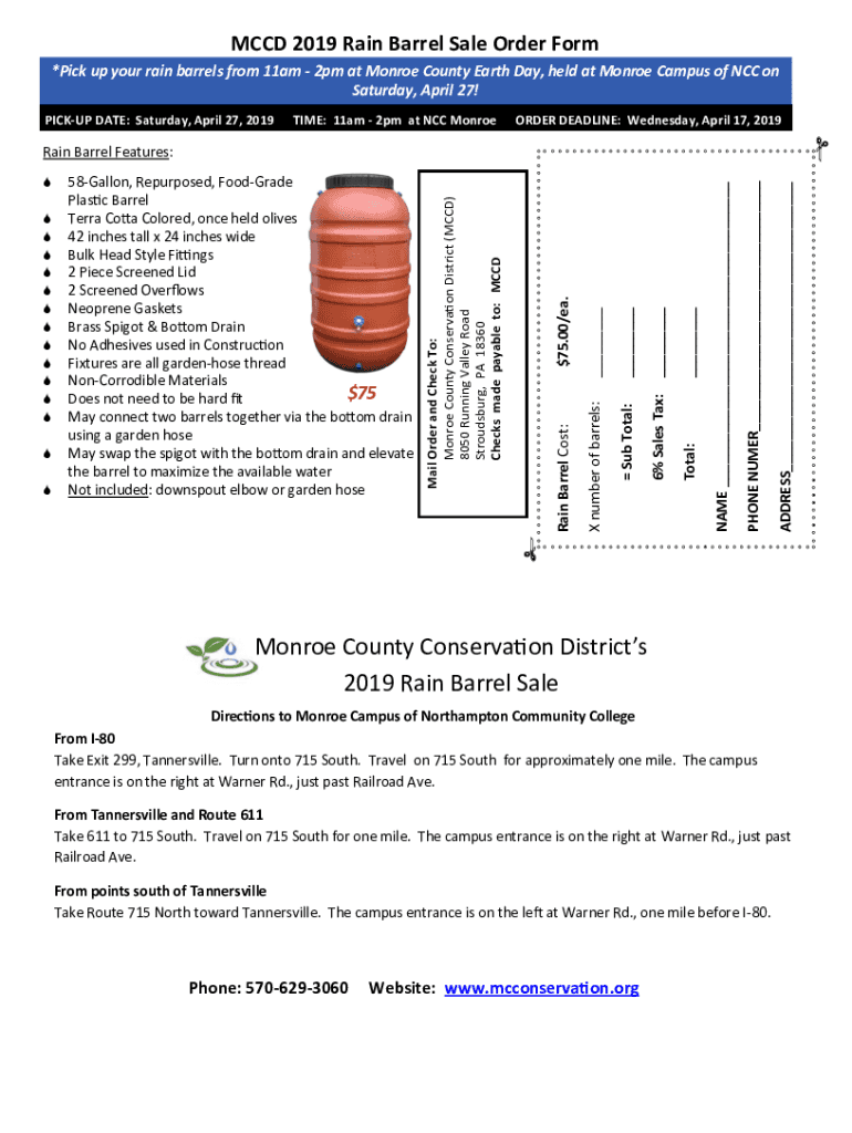CCD 2019 Rain Barrel Sale Order Form *Pick up your rain barrels from 11am 2pm at Monroe County Earth Day, held at Monroe Campus of NCC on Saturday, April 27! PICKUP DATE: Saturday, April 27, 2019TIME:
