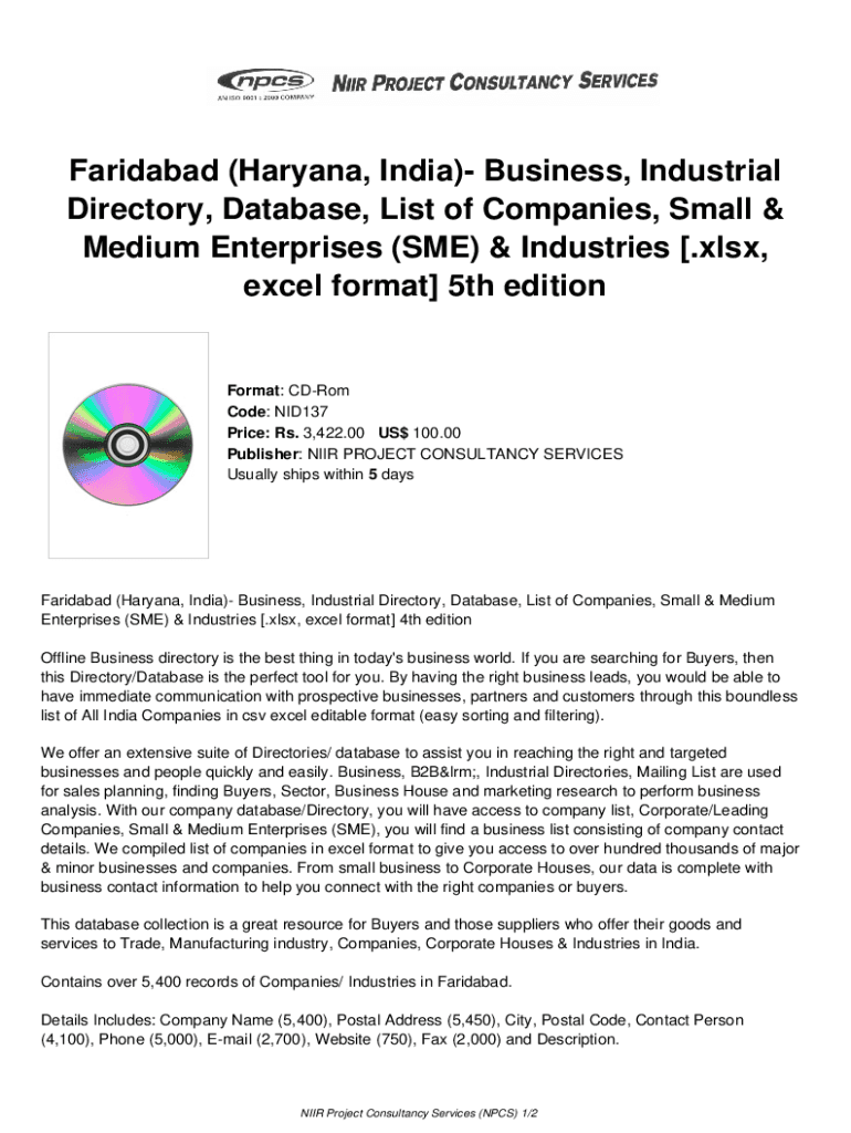 Faridabad (Haryana, India) Business, Industrial Directory, Database, List of Companies, Small & Medium Enterprises (SME) & Industries .xlsx, Excel format 5th editionFormat: CD-ROM Code: NID137 Price:
