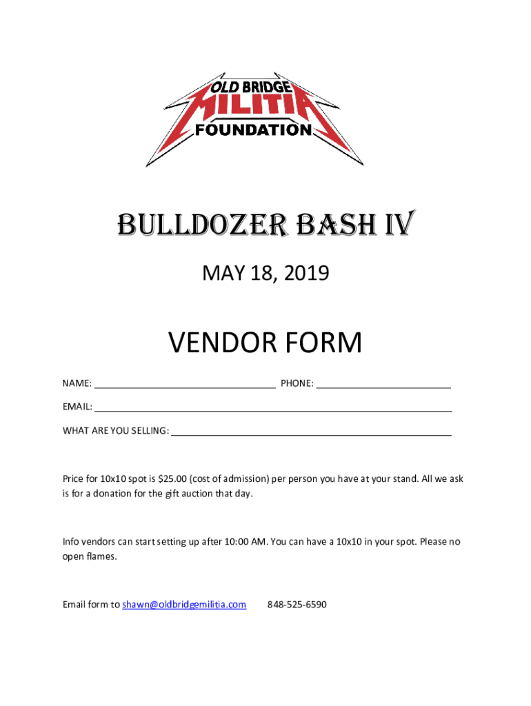 BULLDOZER BASH IV MAY18,2019 VENDORFORM NAME: PHONE: EMAIL: WHATAREYOUSELLING: Pricefor10x10spotis$25.00(costofadmission)perpersonyouhaveatyourstand. Allies isforadonationforthegiftauctionthatday.