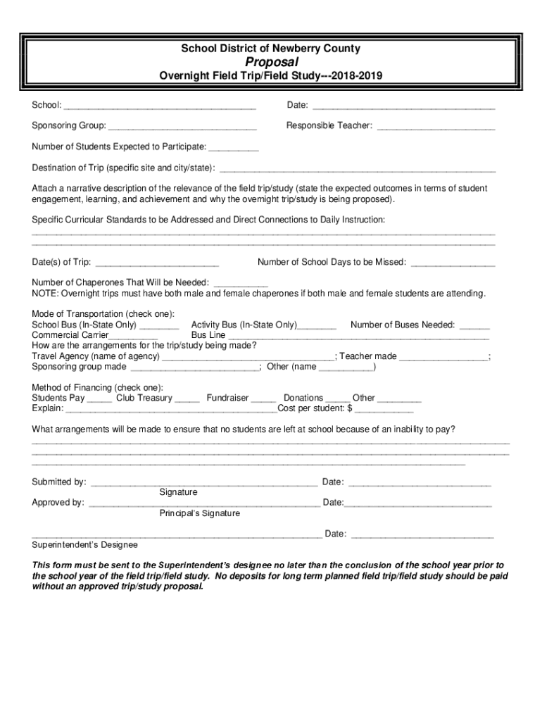 School District of Newberry Counterproposal Overnight Field Trip/Field Study20182019 School: Date: Sponsoring Group: Responsible Teacher: Number of Students Expected to Participate: Destination of