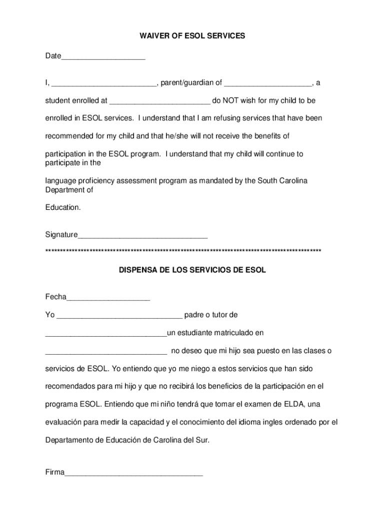 WAIVER OF ESOL SERVICES Date I, parent/guardian of, a student enrolled at do NOT wish for my child to be enrolled in ESOL services. I understand that I am refusing services that have been recommended