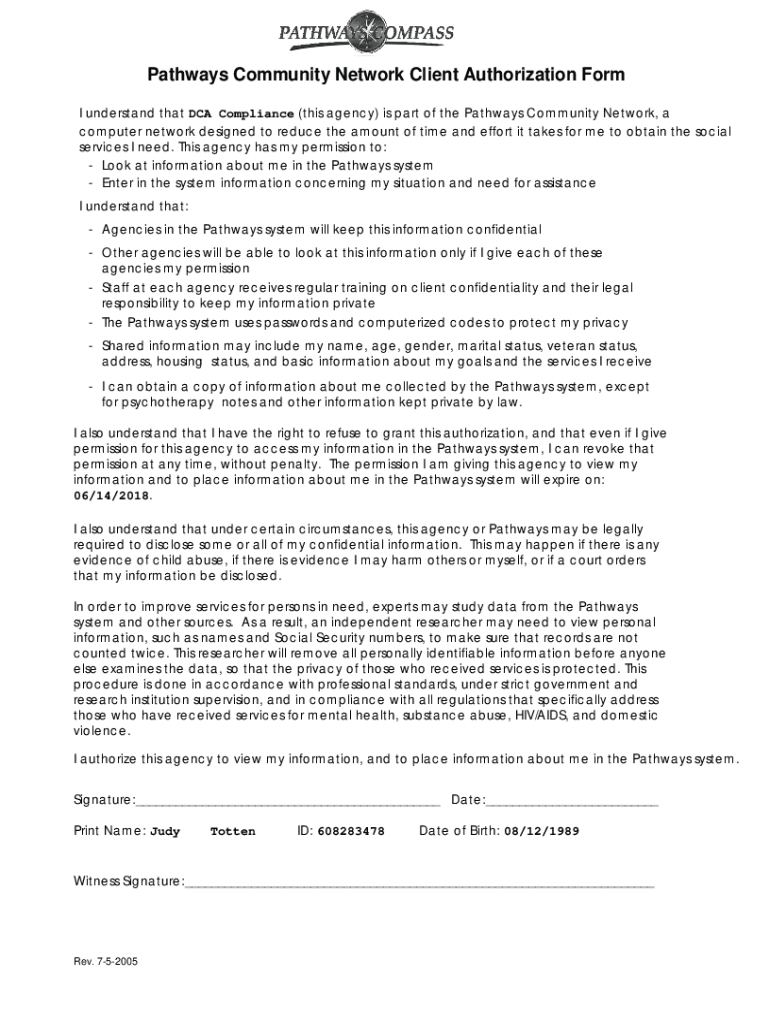 Pathways Community Network Client Authorization Form I understand that DCA Compliance (this agency) is part of the Pathways Community Network, a computer network designed to reduce the amount of time