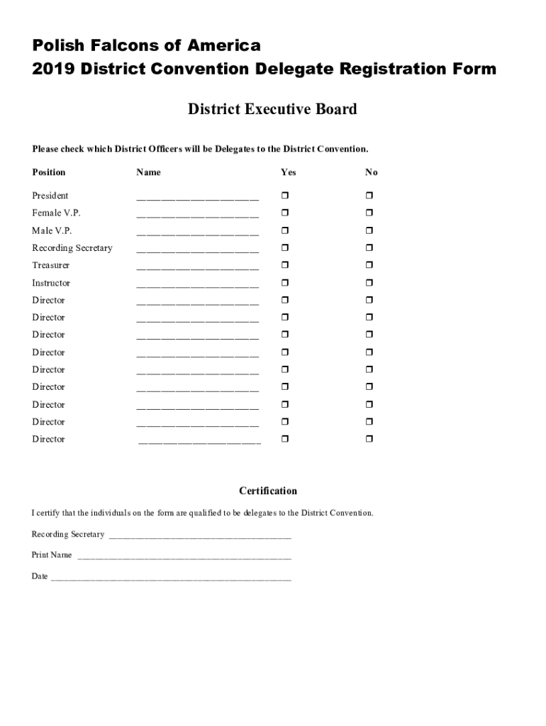 Polish Falcons of America 2019 District Convention Delegate Registration Form District Executive Board Please check which District Officers will be Delegates to the District Convention. PositionNameYesNoPresident
