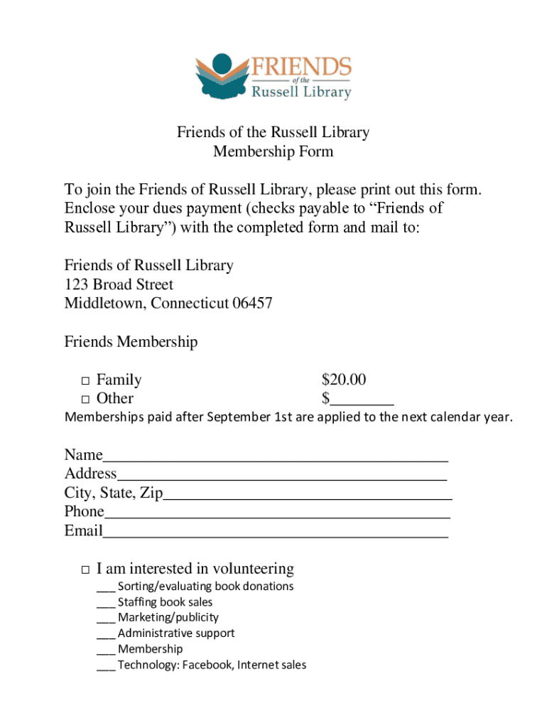 Friends of the Russell Library Membership Form To join the Friends of Russell Library, please print out this form. Enclose your dues payment (checks payable to Friends of Russell Library) with the