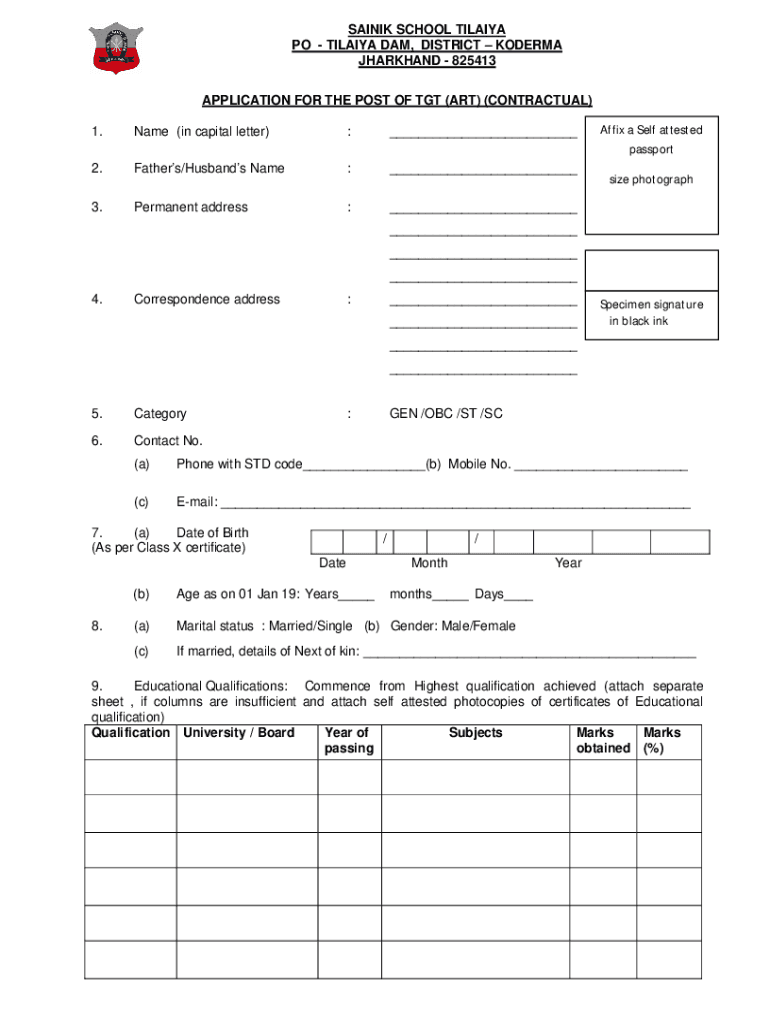 SAINT SCHOOL TILAPIA PO TILAPIA DAM, DISTRICT KORMA JHARKHAND 825413 APPLICATION FOR THE POST OF TNT (ART) (CONTRACTUAL) 1. Name (in capital letter): 2. Fathers/Husbands Name: 3. Permanent address: