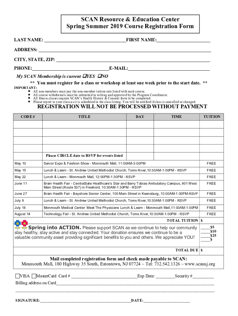 SCAN Resource & Education Center Spring Summer 2019 Course Registration Form LAST NAME: FIRST NAME: ADDRESS: CITY, STATE, ZIP: PHONE: EMAIL: My SCAN Membership is current yes no ** You must register