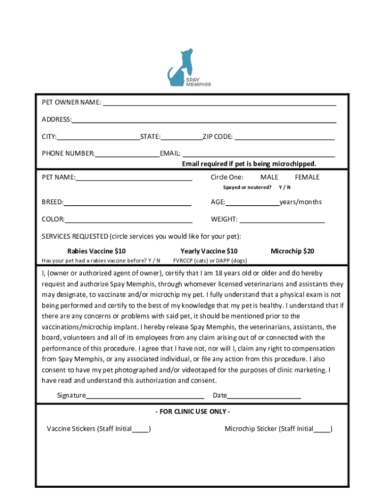 CITY:STATE:PHONE NUMBER:ZIP CODE:EMAIL:PET NAME:Email required if pet is being microchipped.