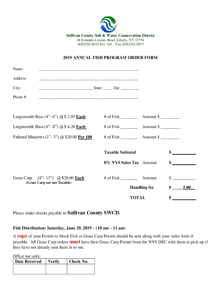 Sullivan County Soil & Water Conservation District 64 FerndaleLoomis Road, Liberty, NY 12754 (845)2926552 Ext. 101 Fax (845)29290732019 ANNUAL FISH PROGRAM ORDER FORM Name: Address: City: State: Zip: