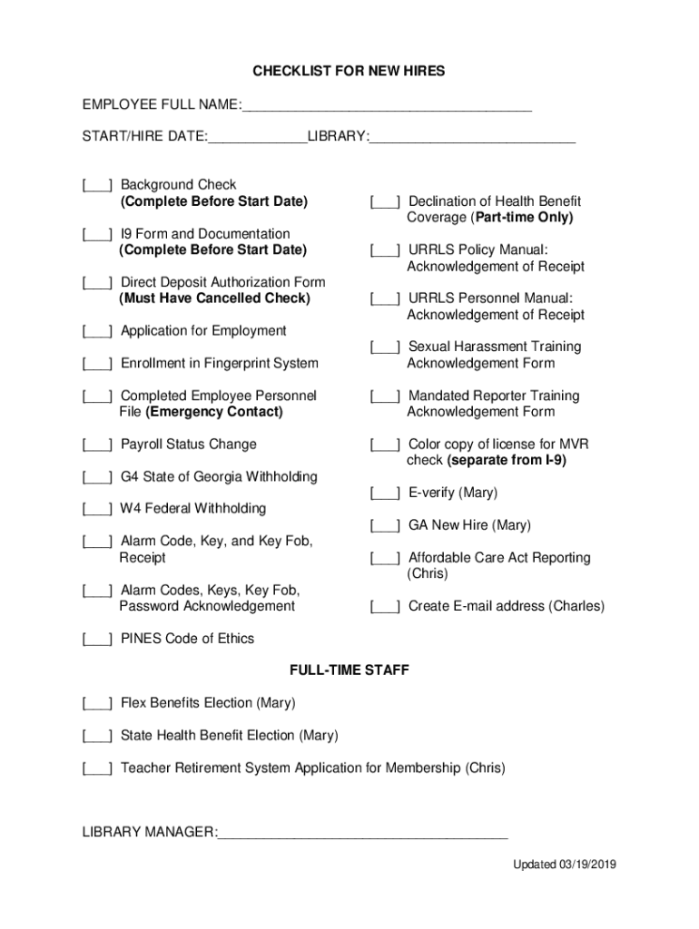 CHECKLIST FOR NEW HIRES EMPLOYEE FULL NAME: START/HIRE DATE: LIBRARY: Background Check (Complete Before Start Date) I9 Form and Documentation (Complete Before Start Date) Direct Deposit Authorization
