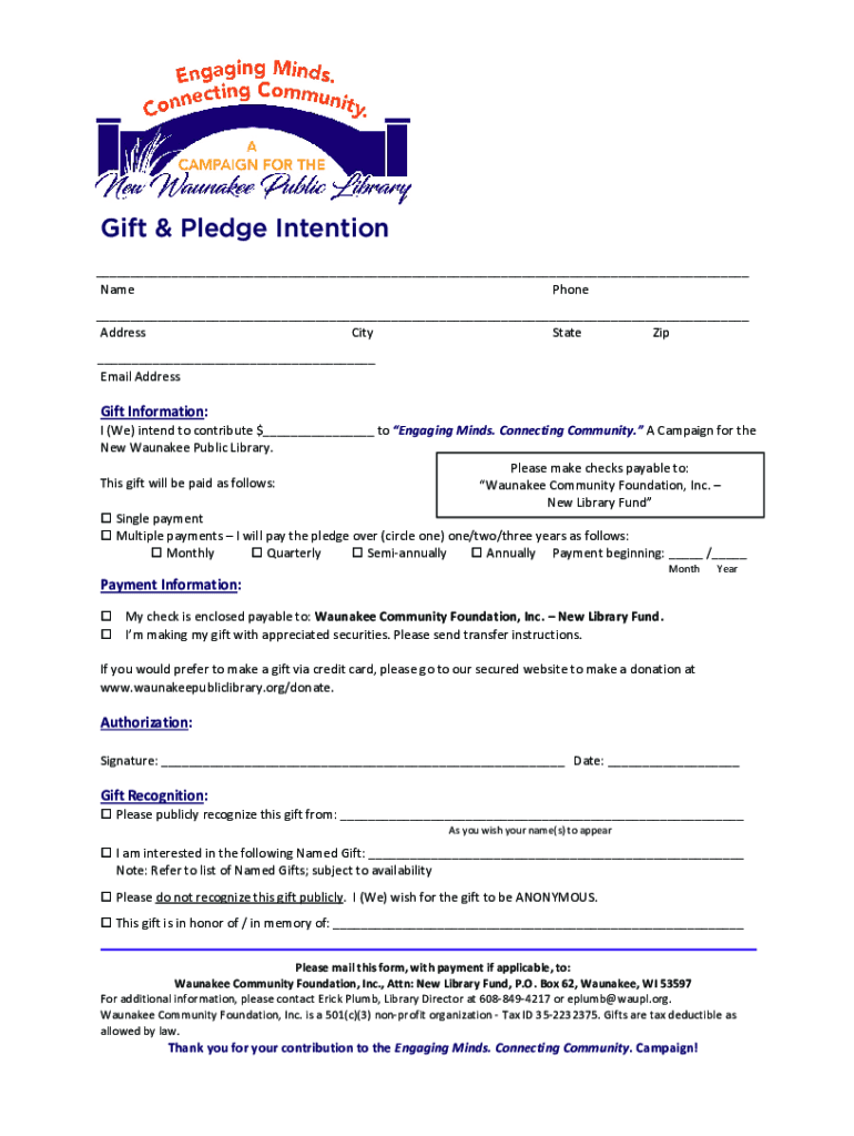 Gift & Pledge Intention Name Phone Address City State Zip Email Addressing Information:I (We) intend to contribute $ to Engaging Minds. Connecting Community. A Campaign for the New Wannabee Public
