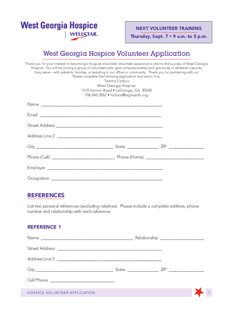 NEXT VOLUNTEER TRAINING Thursday, Sept. 7 9 a.m. to 5 p.m. West Georgia Hospice Volunteer Application Thank you for your interest in becoming a Hospice Volunteer. Volunteer assistance is vital to