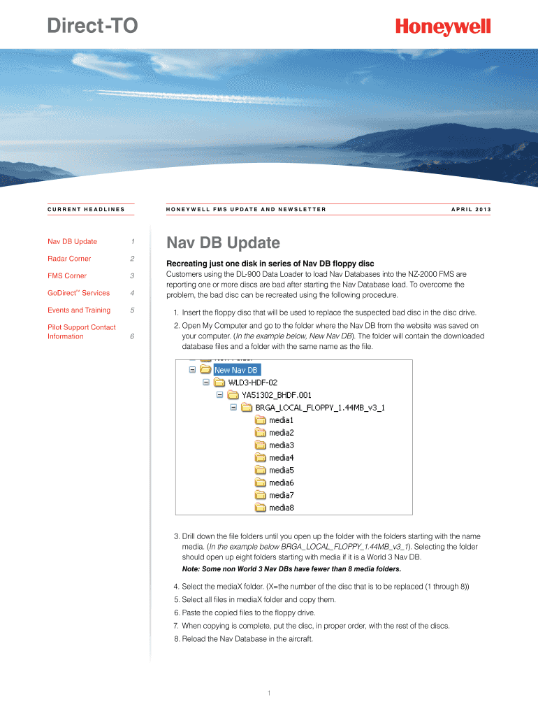 Direct TO CURRENT HEADLINES H O N E Y W E L L F M S U P DAT E A N D N E W S L E T T E R A April 2 0 1 3 Nav DB Update Nav DB Update 1 Radar Corner 2 FMS Corner 3 Direct Services 4 Events and Training