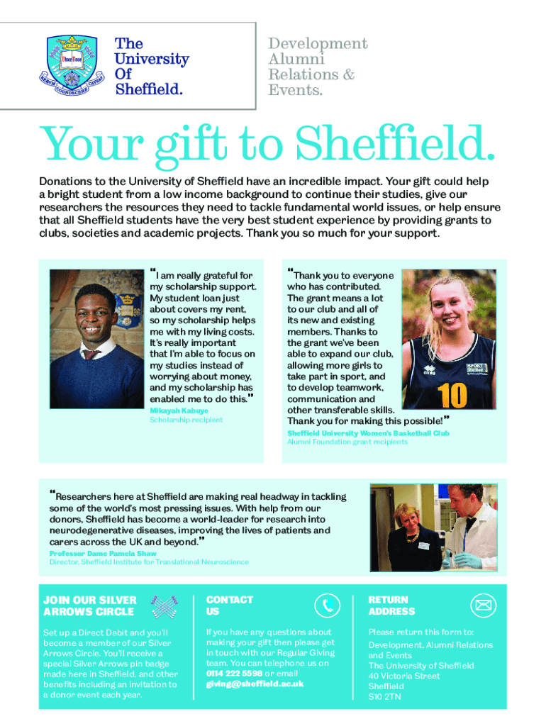 Development Alumni Relations & Events. Your gift to Sheffield. Donations to the University of Sheffield have an incredible impact. Your gift could help a bright student from a low income background