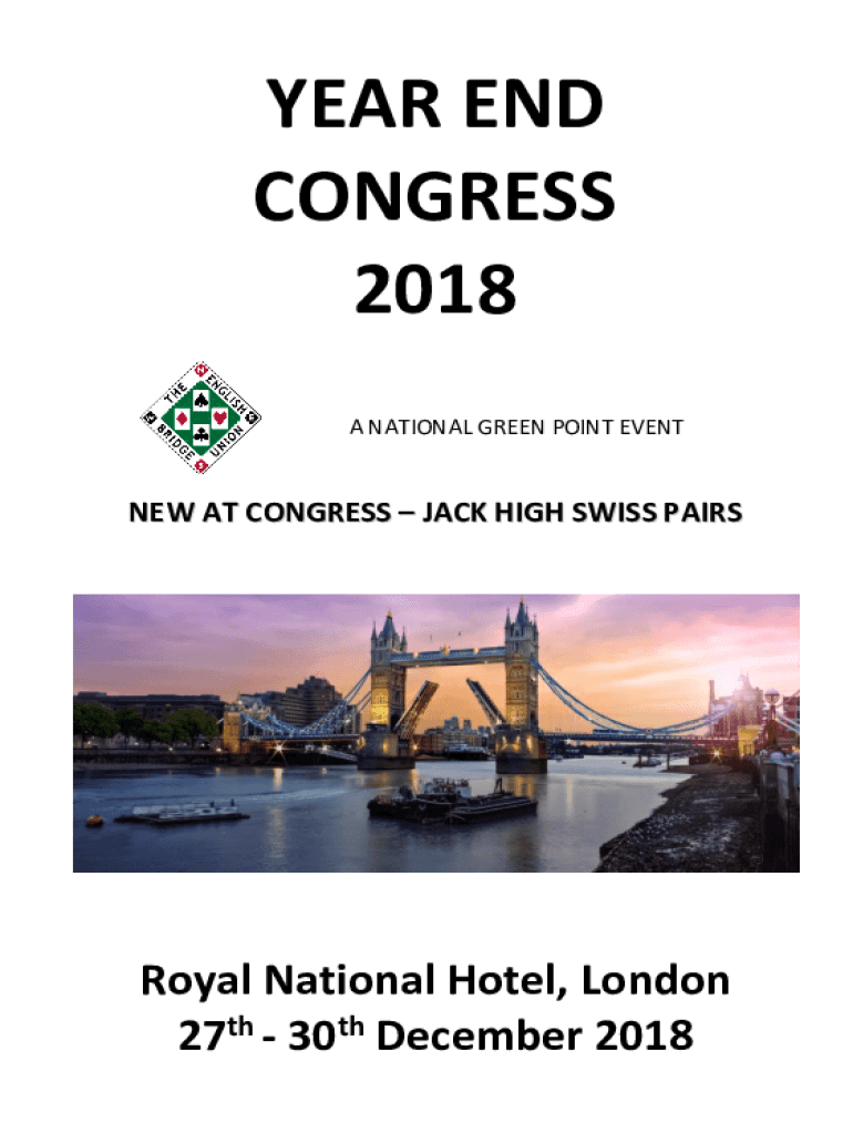 YEAR END CONGRESS 2018 A NATIONAL GREEN POINT EVENT AT CONGRESS JACK HIGH SWISS PAIRS Royal National Hotel, London 27th 30th December 2018Year End Congress Royal National Hotel, London 27th 30th December