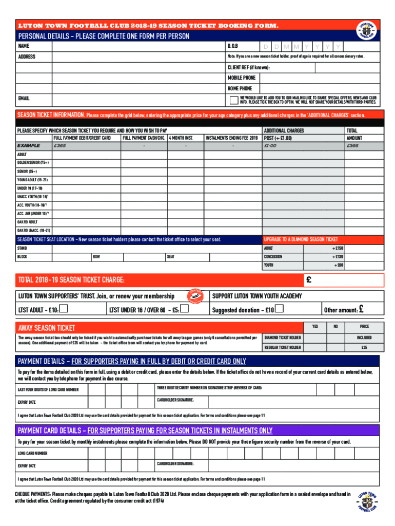 LUZON TOWN FOOTBALL CLUB 201819 SEASON TICKET BOOKING FORM.PERSONAL DETAILS PLEASE COMPLETE ONE FORM PER PERSON NAMED. O.BADDRESSNote: If you are a new season ticket holder, proof of age is required