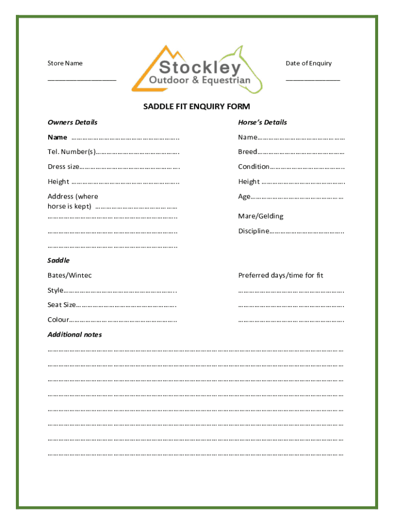 Store Name Date of Inquiry SADDLE FIT Inquiry FORM Owners DetailsHorses DetailsName. Gamete. Number(s). Readdress size. Condition. Height