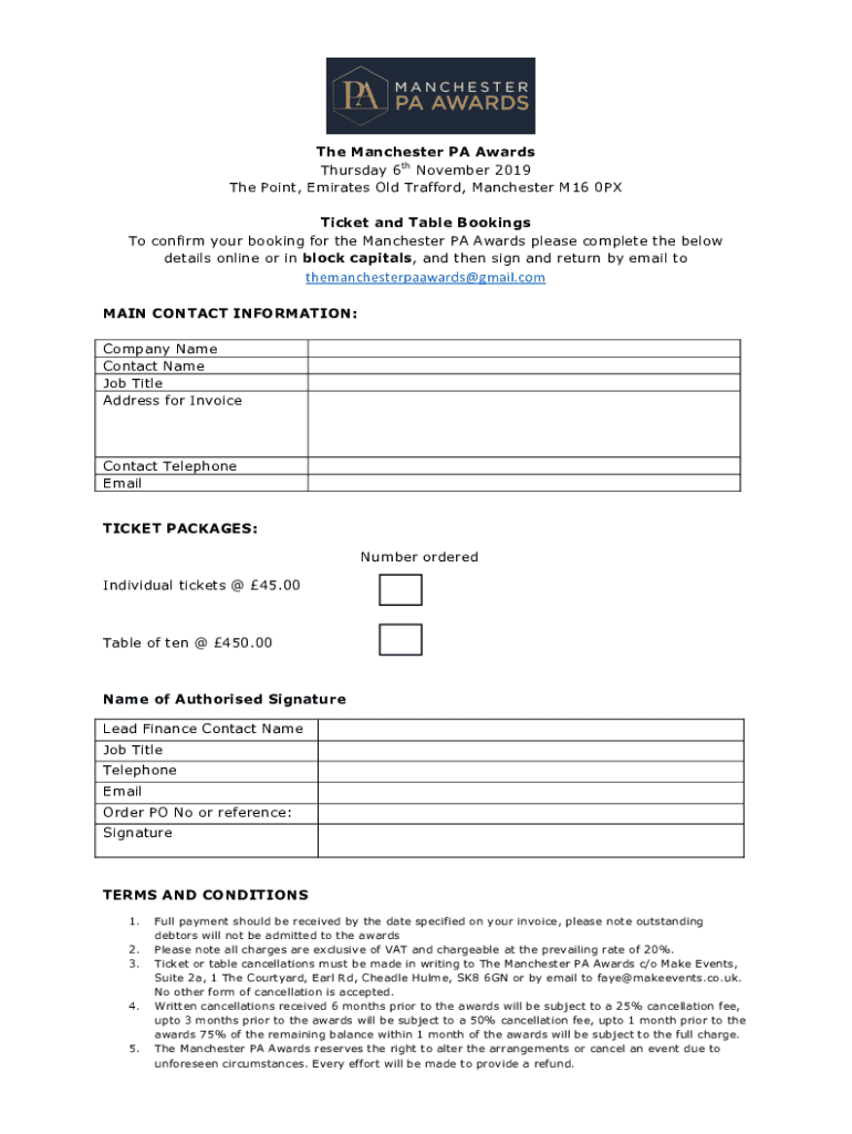 The Manchester PA Awards Thursday 6th November 2019 The Point, Emirates Old Trafford, Manchester M16 0PX Ticket and Table Bookings To confirm your booking for the Manchester PA Awards please complete