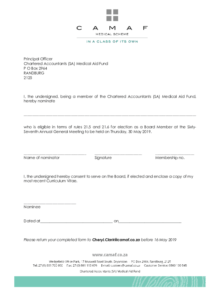 Principal Officer Chartered Accountants (SA) Medical Aid Fund P O Box 2964 SANDBURG 2125I, the undersigned, being a member of the Chartered Accountants (SA) Medical Aid Fund, hereby nominate who is