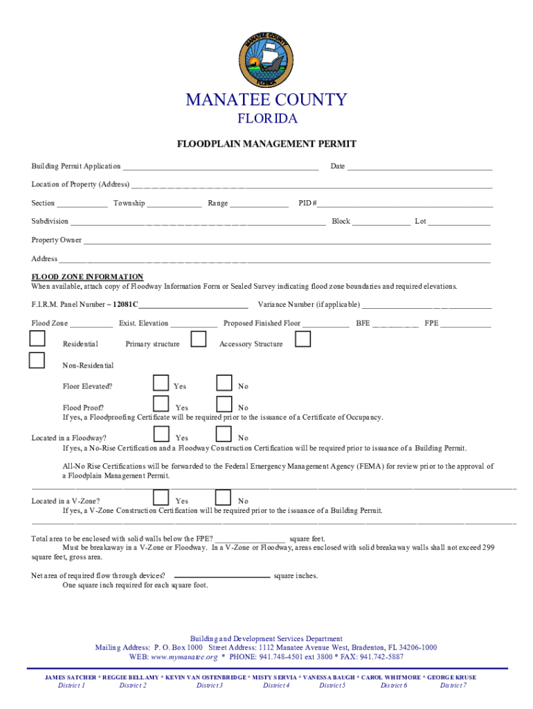 MANATEE COUNTY FLORIDAFLOODPLAIN MANAGEMENT PERMIT Building Permit Application Date Location of Property (Address) Section Township Range PID # Subdivision Block Lot Property Owner Address FLOOD ZONE