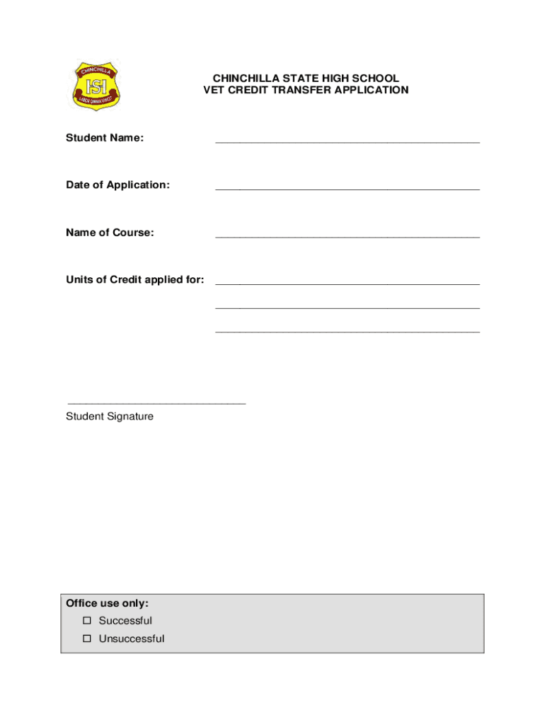 CHINCHILLA STATE HIGH SCHOOL VET CREDIT TRANSFER APPLICATIONStudent Name: Date of Application: Name of Course: Units of Credit applied for: Student SignatureOffice use only: Successful Unsuccessful