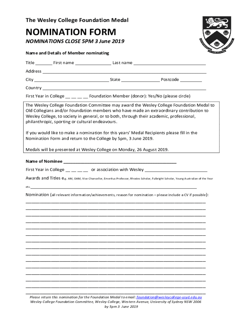 TheWesleyCollegeFoundationMedal NOMINATIONFORM NOMINATIONSCLOSE5PM3June2019 NameandDetailsofMembernominating Title First name Last name Address City State Postcode Country FirstYearinCollege FoundationMember(donor):Yes/No(please
