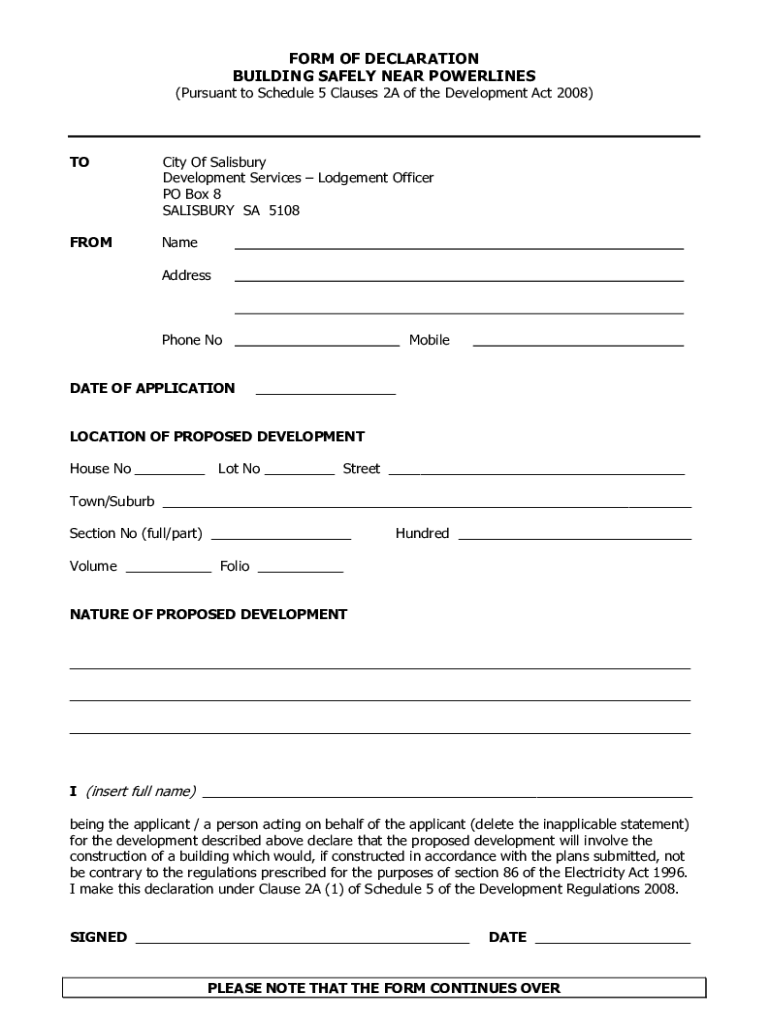 FORM OF DECLARATION BUILDING SAFELY NEAR PIPELINES (Pursuant to Schedule 5 Clauses 2A of the Development Act 2008)City Of Salisbury Development Services Judgement Officer PO Box 8 SALISBURY SA 5108FROMName